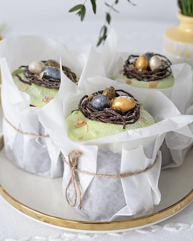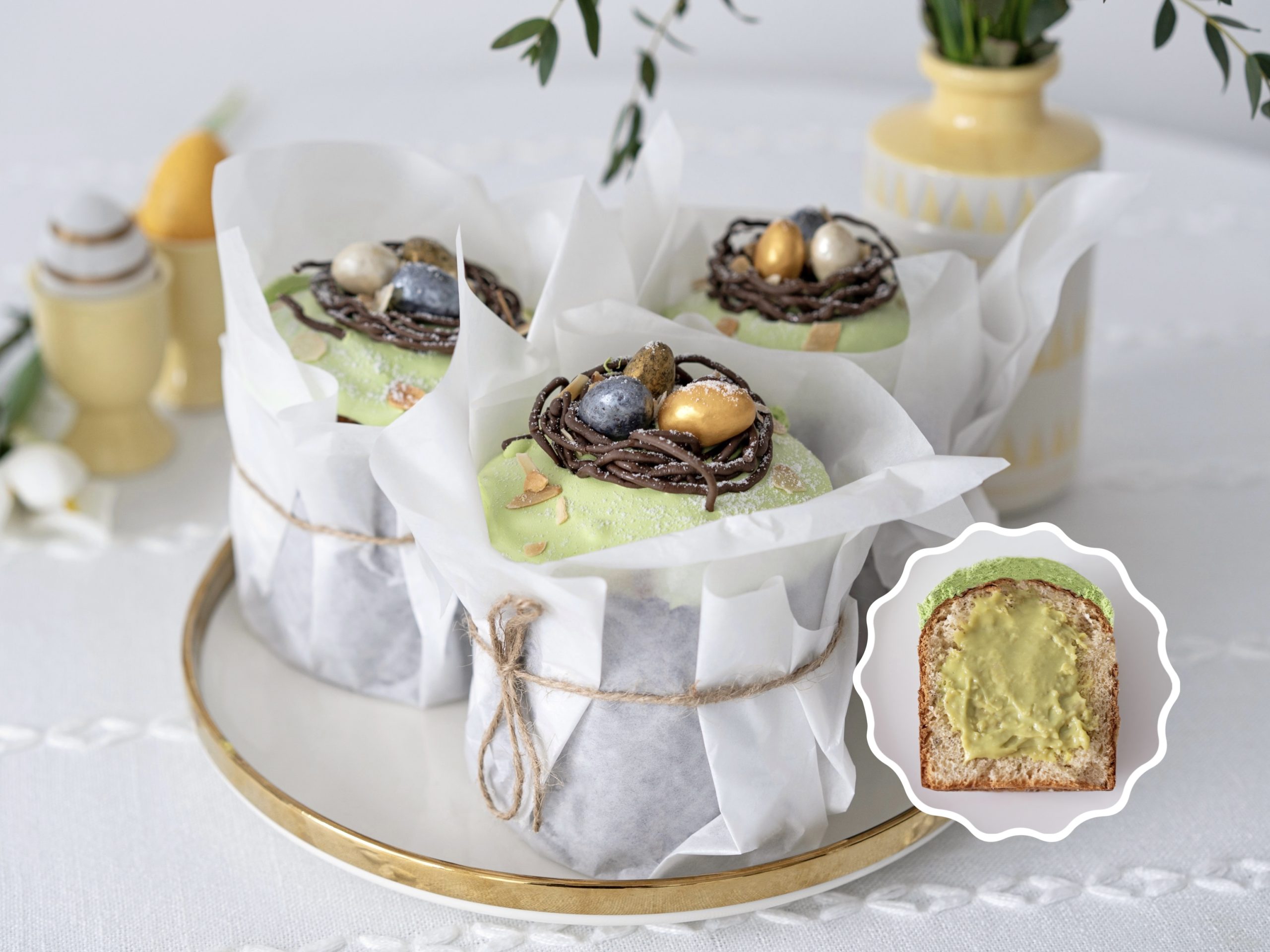 Наши фирменные куличи — это праздник. Воздушное дрожжевое тесто, щедро усыпанное клюквой и изюмом, внутри — нежный фисташковый заварной крем, которого действительно много. Сверху — шапка воздушной меренги, украшенная миндалем в глазури. Набор из 3х штук