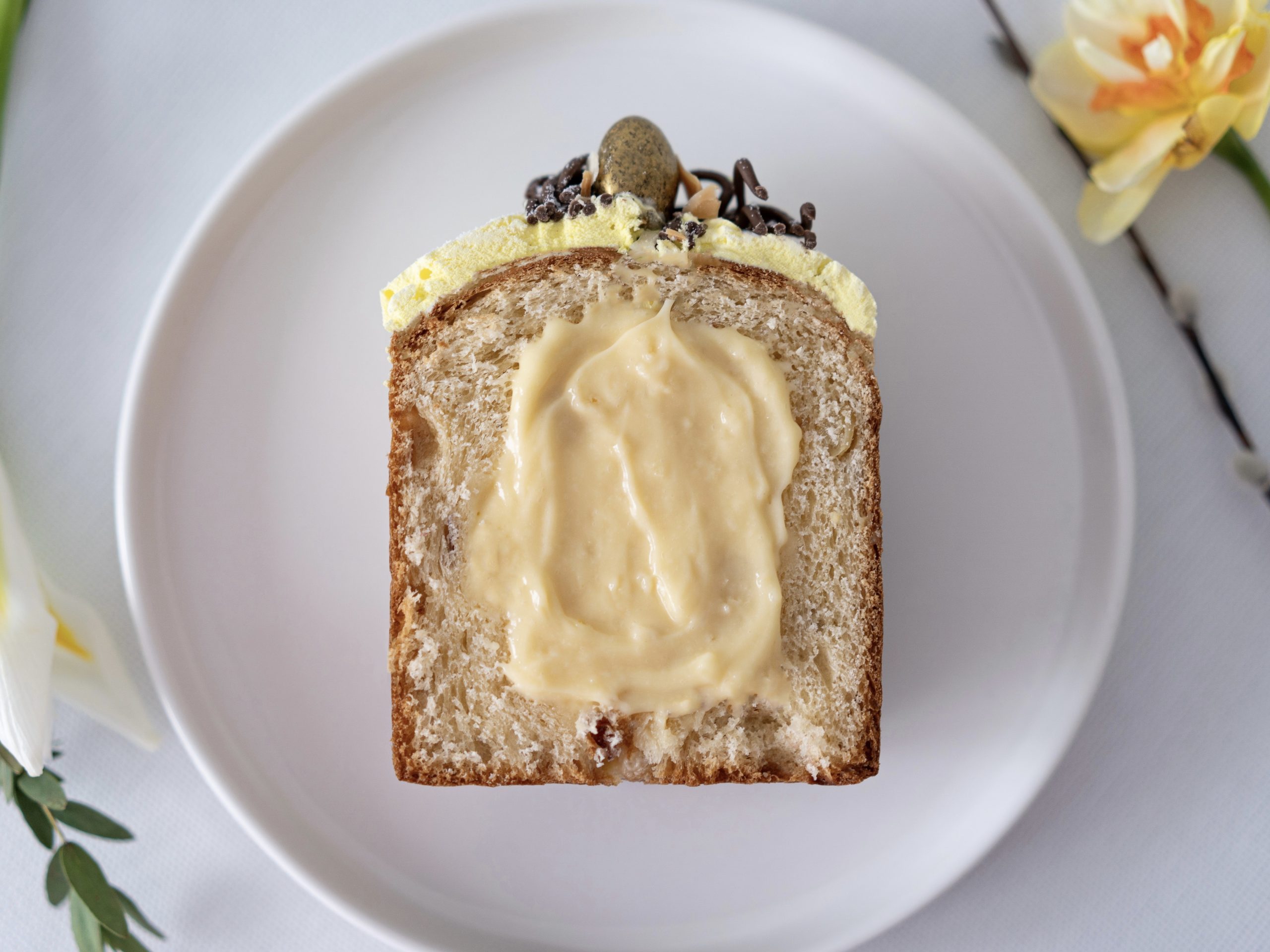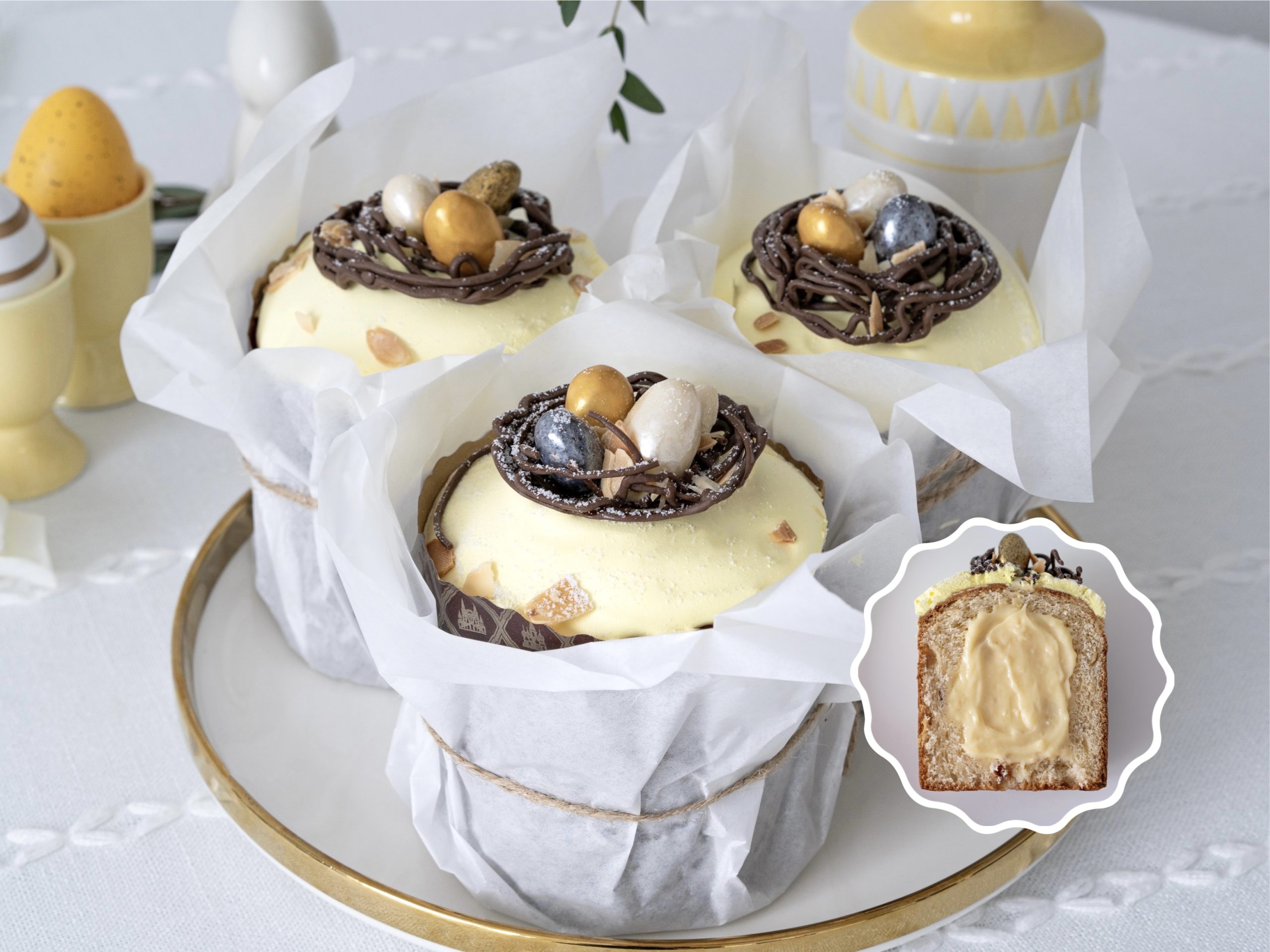 Наши фирменные куличи — это праздник. Воздушное дрожжевое тесто, щедро усыпанное клюквой и изюмом, внутри — нежный ванильный заварной крем, которого действительно много. Сверху — шапка воздушной меренги, украшенная миндалем в глазури. Набор из 3х штук