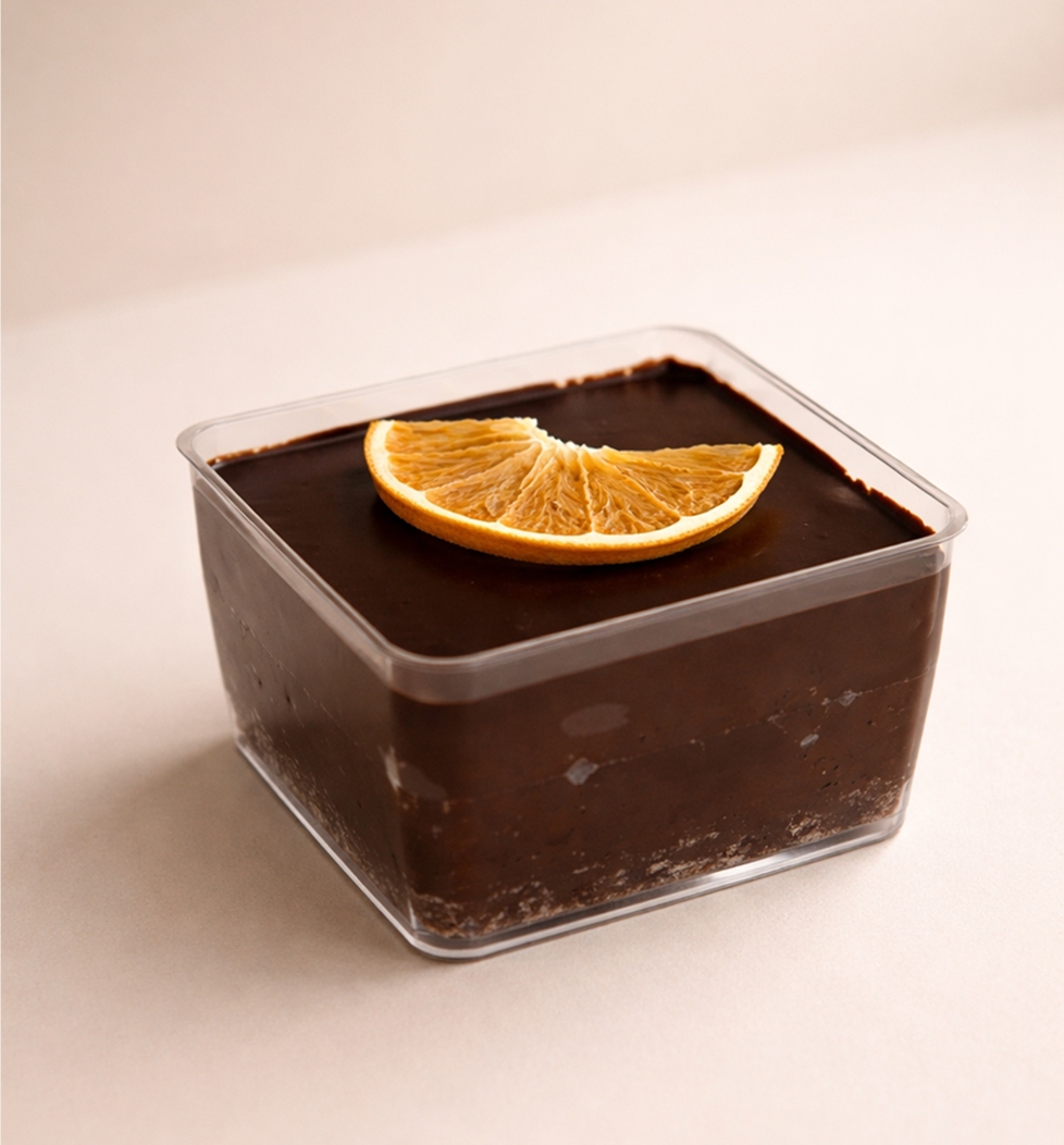 Миндально-финиковая основа, насыщенный шоколадный крем и апельсиновые цукаты.