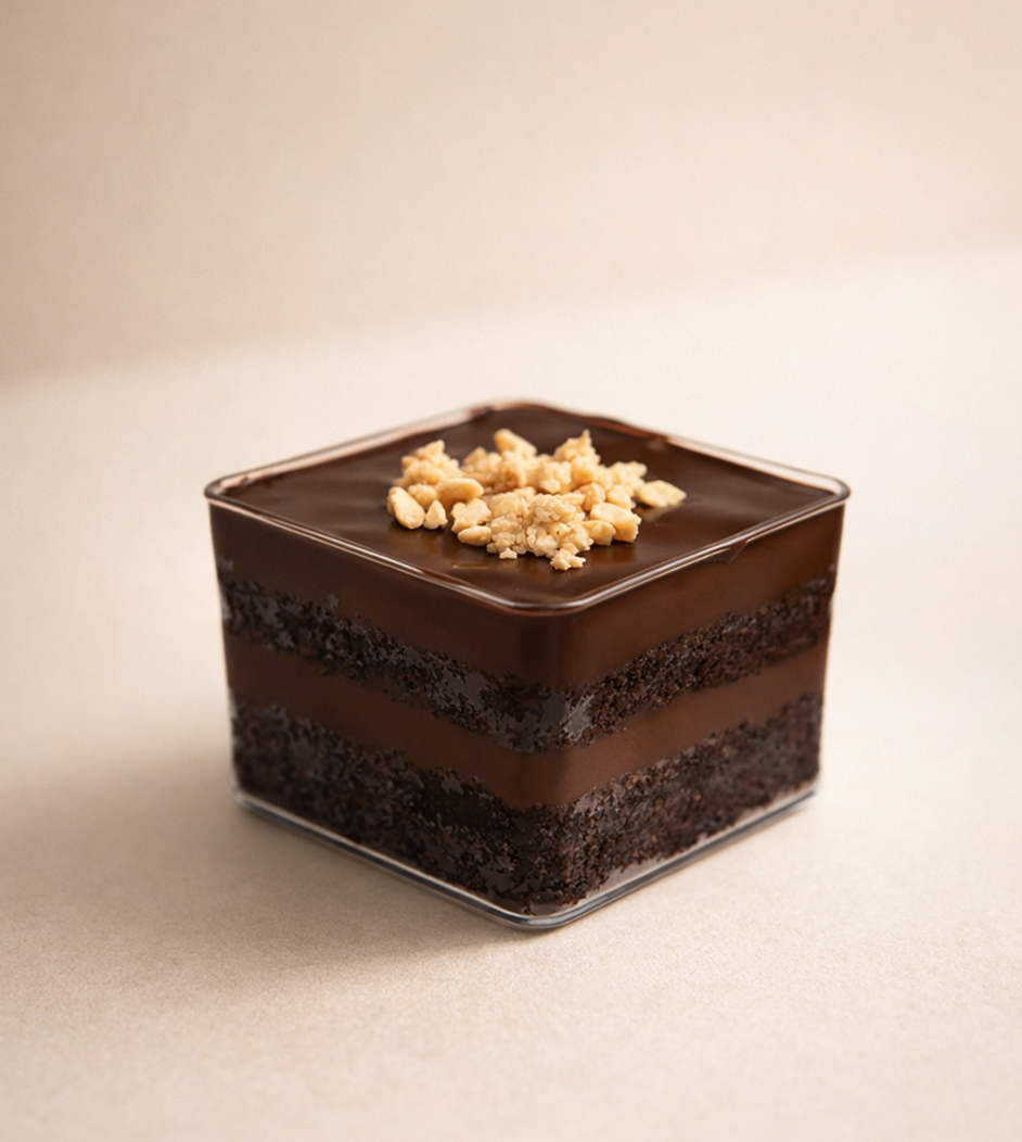 Влажный шоколадный бисквит, крем на растительном молоке с шоколадом и арахисовой пастой, покрытый ганашем.