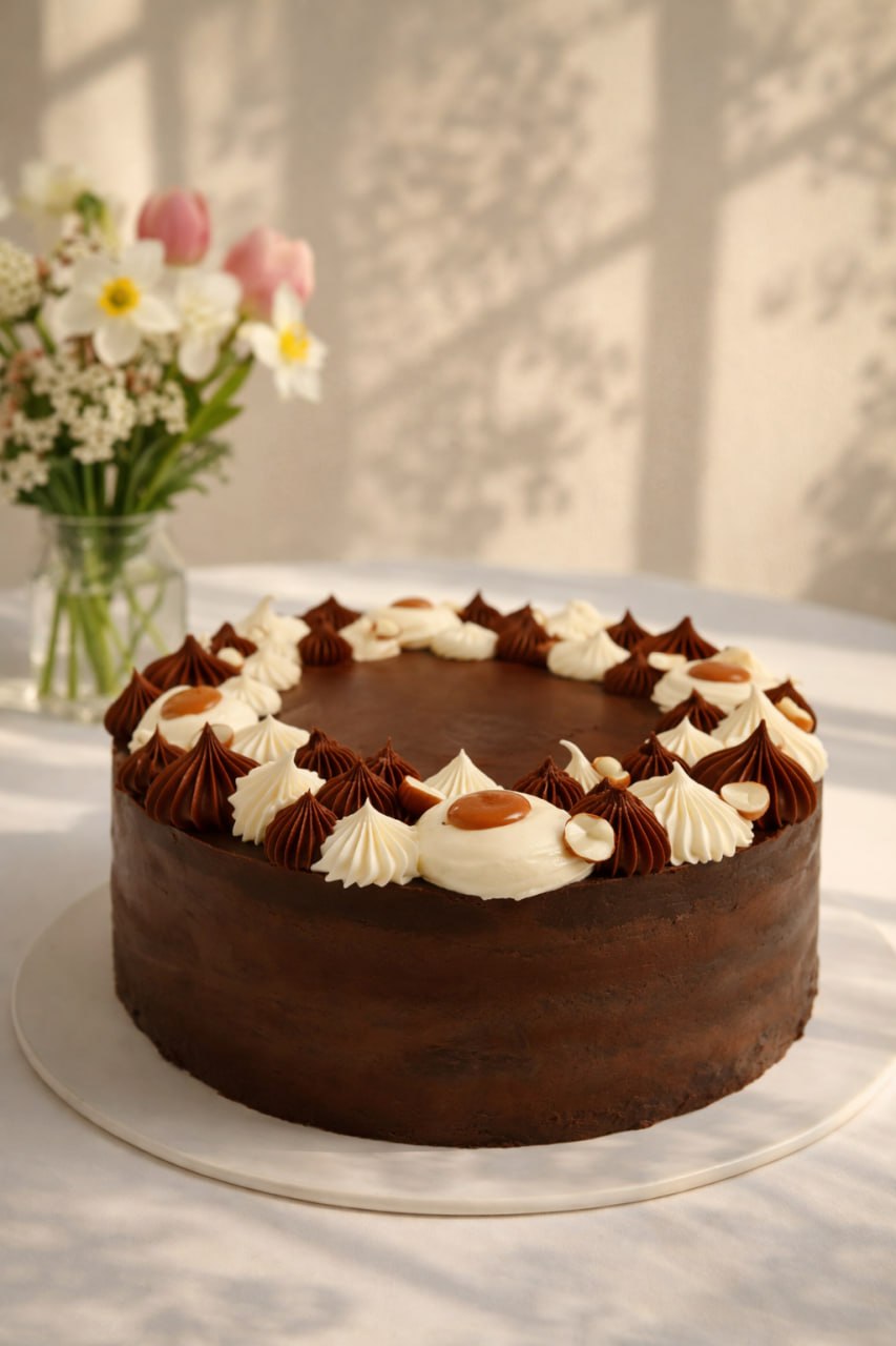 Влажный шоколадный бисквит, нежный заварной крем на основе соевого или миндального молока с тёмным шоколадом и арахисовой пастой. Сверху — гладкий слой насыщенного шоколадного ганаша.